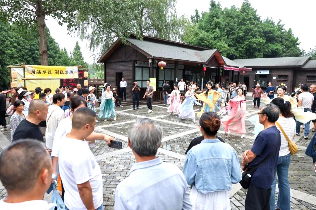 “月满华诞·潮玩溱湖”。“双节”期间,溱湖风景区推出一系列融合传统与潮流的特色活动:水上表演惊艳亮相,展现水乡灵动之美;簖蟹品鉴活动让游客大快朵颐,解锁秋日限定美味;“苏超巡游”自带热度,点燃体育激情,花神舞韵灵动,簖蟹人偶巡游互动,NPC情景表演贯穿其间。现场更设置“巧手匠心”手工体验区、“趣味钓蟹”“苏超趣味点球挑战”“苏超球员连连看”等互动游戏,从动手体验到趣味竞技,全方位满足不同游客的游玩需求,让大家在沉浸式体验中感受姜堰魅力。