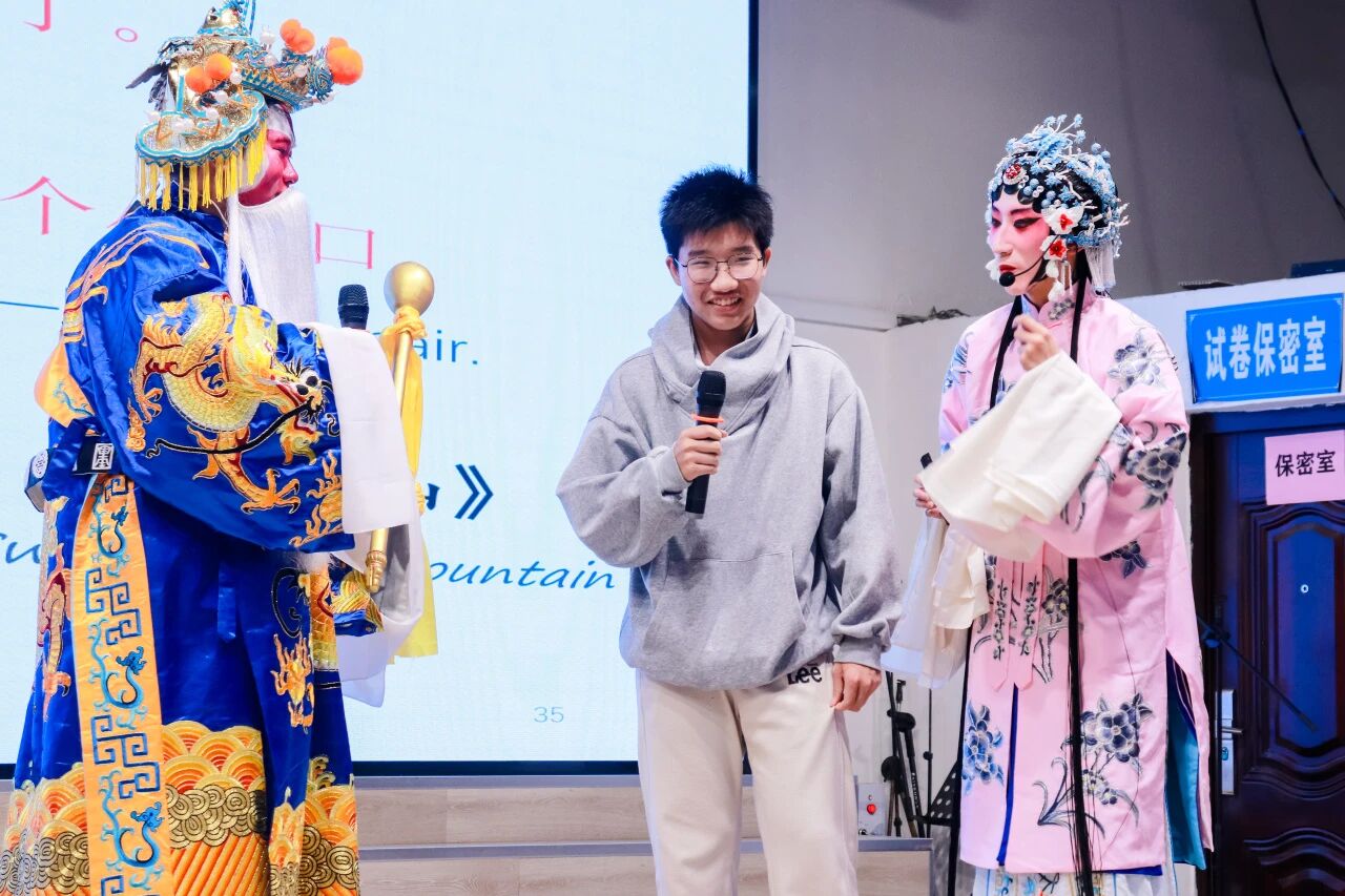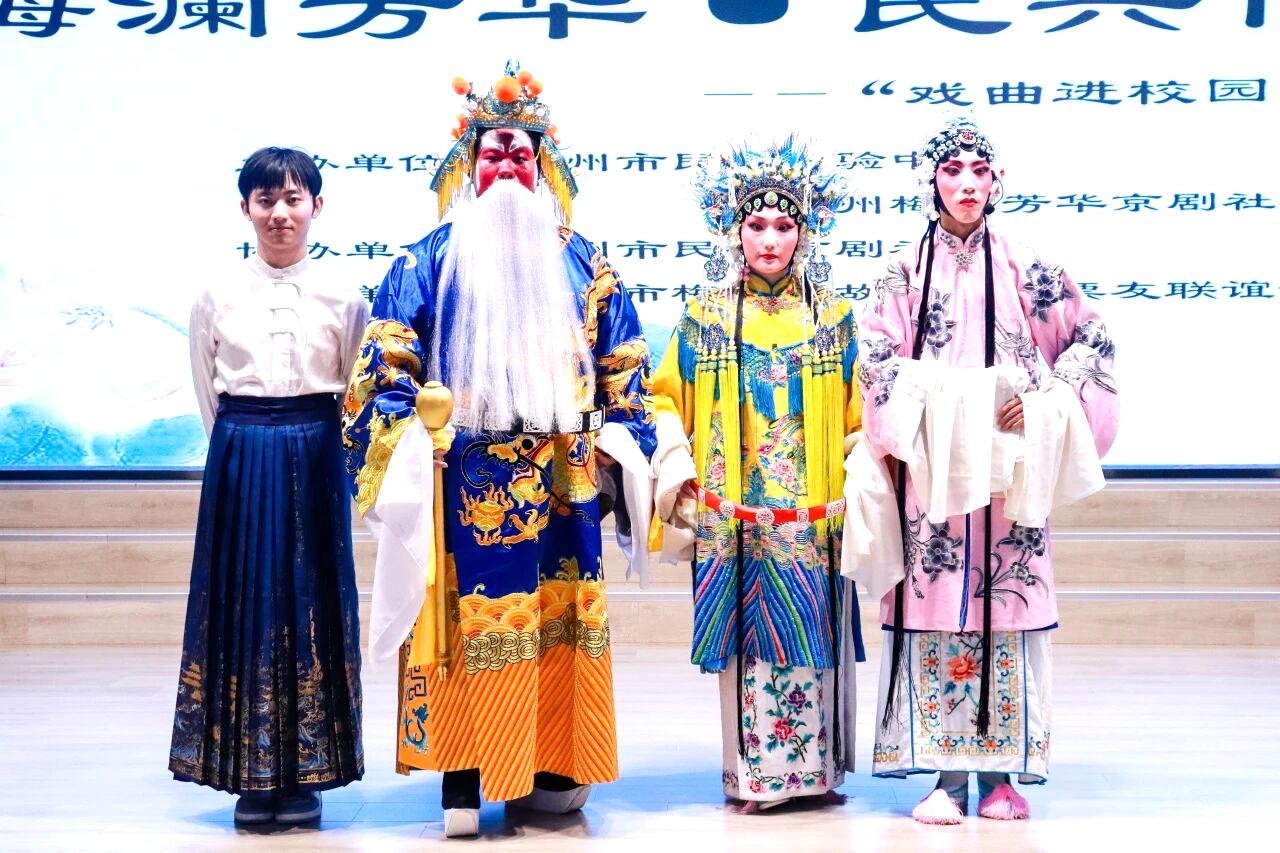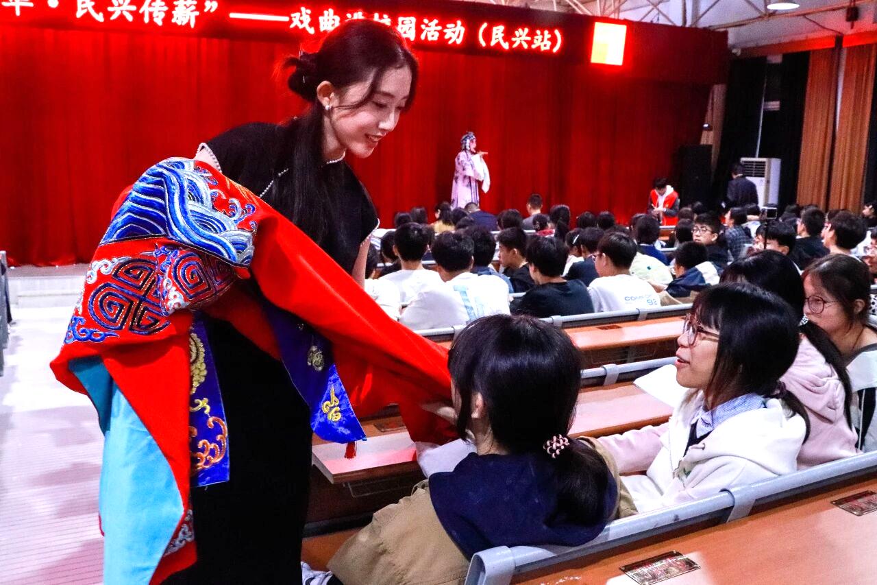 演出过程中,来自泰州梅澜芳华京剧社的艺术家上台讲解京剧“四功五法”、旦角四大流派、念白技巧以及昆曲工尺谱等专业知识,学生踊跃上台体验戏曲招式,在互动中加深对戏曲艺术的认知。