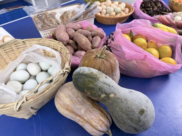 “家人们看过来,这是刚从地里摘来的南瓜,又面又甜,是咱蒋北村的老品种!”蒋北村村部的“交邮快供”寄递服务站里,村支书正对着手机镜头热情吆喝,身旁的助播不时拿起产品展示,配合补充讲解。总社的工作人员正手把手指导直播的村干部调整镜头角度、讲解产品卖点,镜头前筐里的土鸡蛋色泽鲜亮,红薯表皮裹着一层薄薄沙土,脆柿色泽橙红果肉饱满。