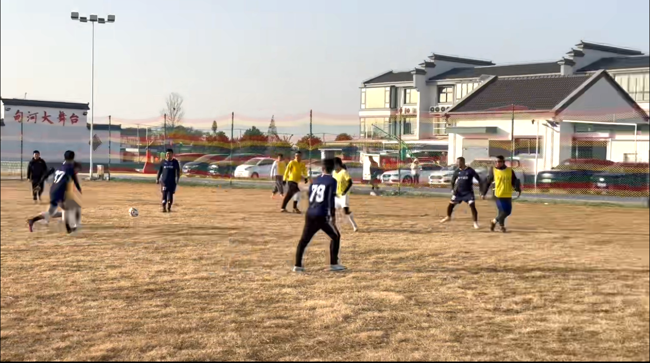 下午两点,裁判哨声响起,20余名身着不同色系队服的足球爱好者迅速进入状态,分成两队展开激烈对决。尽管没有苏超赛场上球员精湛的职业水准,他们却同样有着对足球的赤诚热爱。带球突破时的专注、默契传球时的呼应、飞身扑救时的果敢,每一个动作都复刻着苏超赛场的热血与坚守,让乡村广场变成了迷你“足球圣殿”。