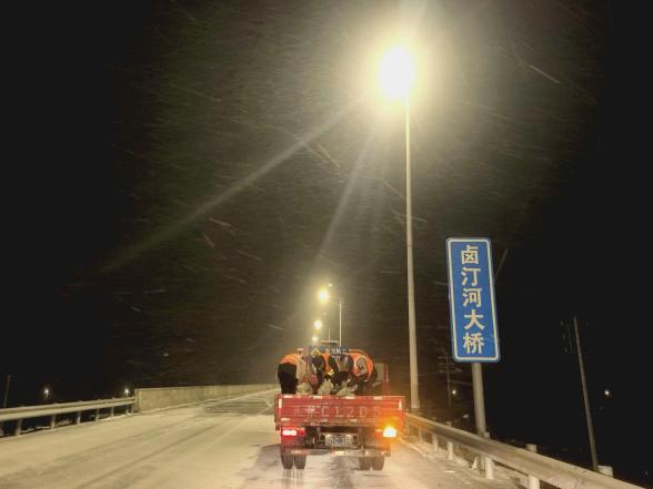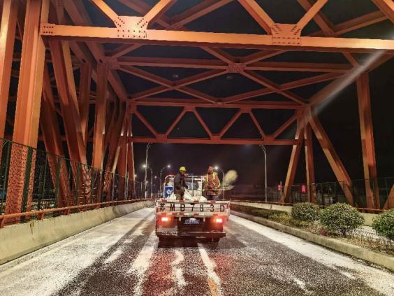 精准预判低温雨雪天气影响,提前储备融雪剂约70吨、防滑沙及各类应急物料,全面满足除冰保畅需求;同步对铲雪车、融雪剂撒布机、养护巡查车等各类除雪设备开展专项检修,完成调试、油料加注等前期准备,确保所有设备性能完好、随时待命出征;雨雪冰冻天气应急小分队24小时不间断轮班值守与道路巡查,1月19日,养护人员在下雪之前对桥梁、易积雪结冰路段撒布26吨融雪剂;强化前置防控,做到“雪未下、人先到,冰未结、措施到”,全力提升应急处置效率。