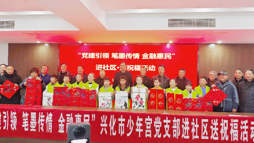 1月17日,兴化市少年宫、老教协与江苏银行兴化支行在景范社区新时代文明实践站联合举办“党建引领 笔墨传情 金融惠民”进社区送祝福活动。鲜红的对联纸整齐铺展,笔墨纸砚一应俱全。几位老师各展所长,有的挥毫书写春联,真草隶篆诸体兼备,笔锋或雄浑豪放、或娟秀雅致;有的专注书写“福”字,篆体的古朴、行书的流畅,一个个饱满喜庆的“福”字跃然纸上,承载着美好祝愿。