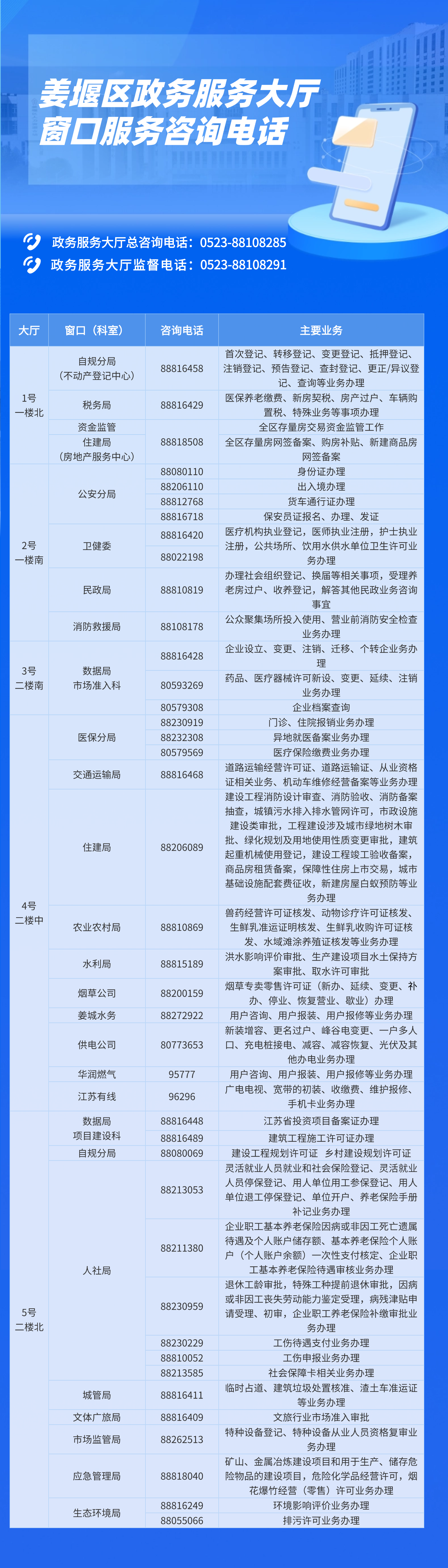 姜堰区政务服务事项办理咨询电话“一站式”大全为持续优化营商环境,打造姜堰营商环境“第一窗口”,区数据局现公布最新版《姜堰区政务服务电话册》,明确全区政务服务事项办理统一咨询渠道,进一步提升政务服务效能与办事便利度。本次公布的电话册全面汇总了区级政务服务大厅各窗口、各镇(街道)便民服务中心及个体、农专、食品经营许可(备案)等事项咨询服务电话,竭诚为每一位办事群众和企业提供清晰、精准、高效的办事服务指引。敬请收藏、相互转告。