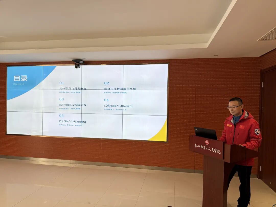 会上,徐亮从岗位职责与科考概况、南极内陆极端艰苦环境、医疗保障与伤病处置、后勤保障与团队协作、收获体会与思想感悟五个方面,深情讲述了难忘的南极征程。他详细介绍了在极寒、强风、缺氧等极端条件下,如何克服重重困难,坚守医疗岗位,全程做好科考队员健康监测、常见病诊疗、急症处置、心理疏导及健康宣教等工作,以专业医术与责任担当,为科考队顺利完成各项任务筑牢生命健康防线,充分展现了泰州二院医务工作者特别能吃苦、特别能战斗、特别能奉献的精神风貌。