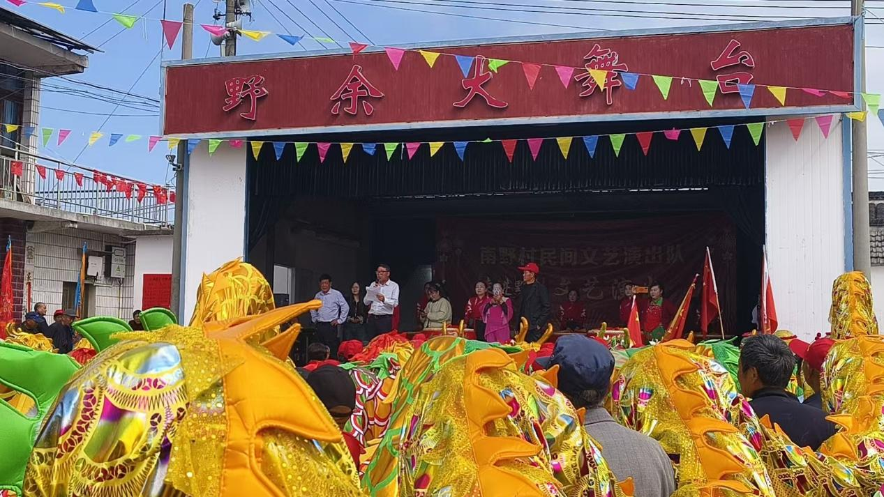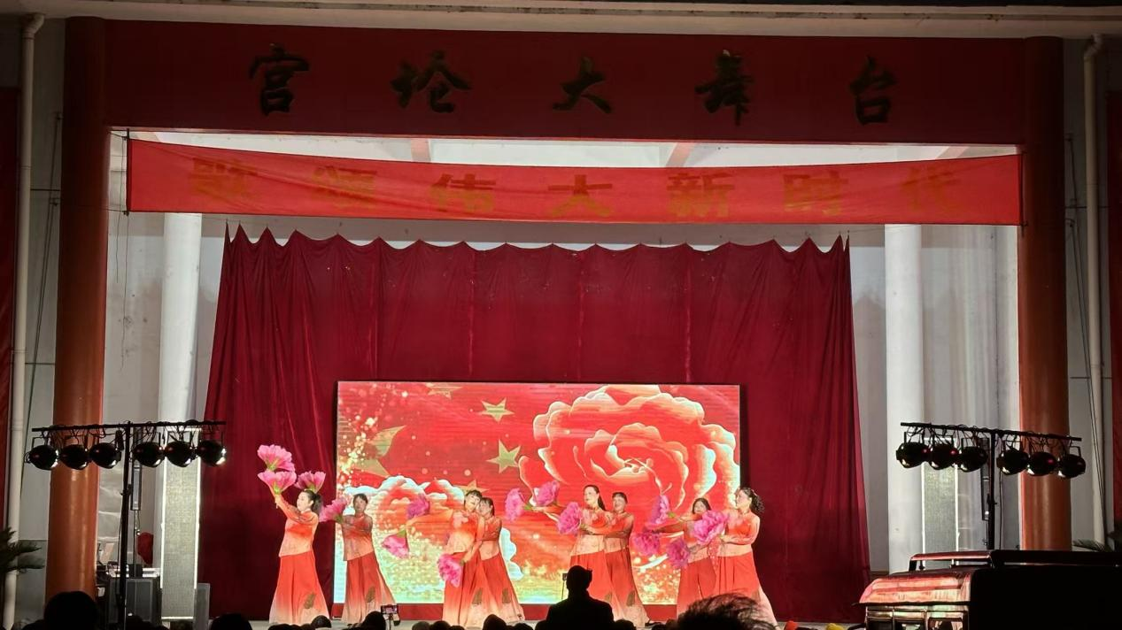在南野村,演出在一场气势十足的舞龙表演中开场,十几名青壮年村民组成的舞龙队,高举长龙绕场三周,龙身随着鼓点上下翻飞,引得观众连连叫好。淮剧《定能战胜顽敌度难关》选段中,老演员嗓音高亢激越,将革命英雄主义气概表现得淋漓尽致,台下不少老党员听得热泪盈眶。村民们自发跟着节奏拍手合唱《东方红》《没有共产党就没有新中国》等多首经典曲目,现场气氛庄重而热烈。
