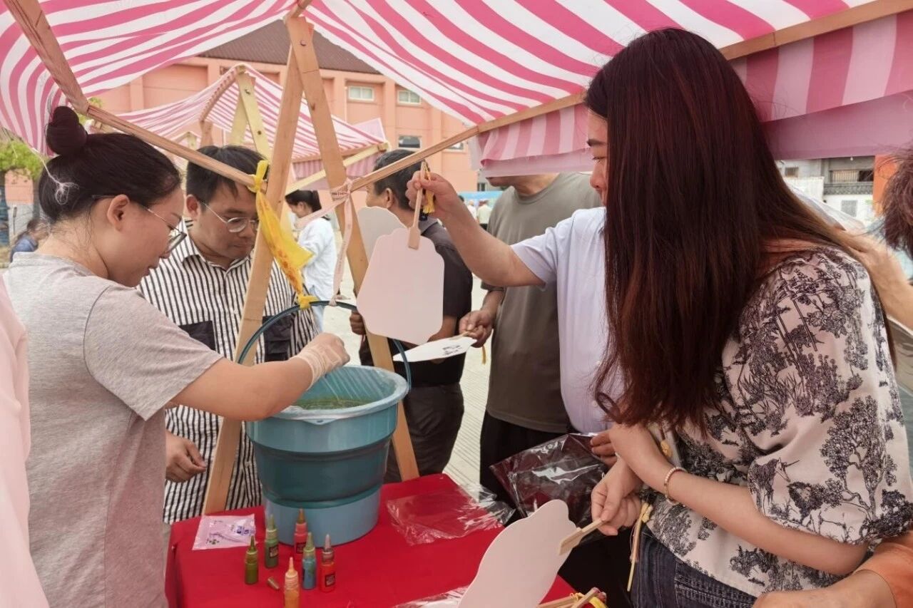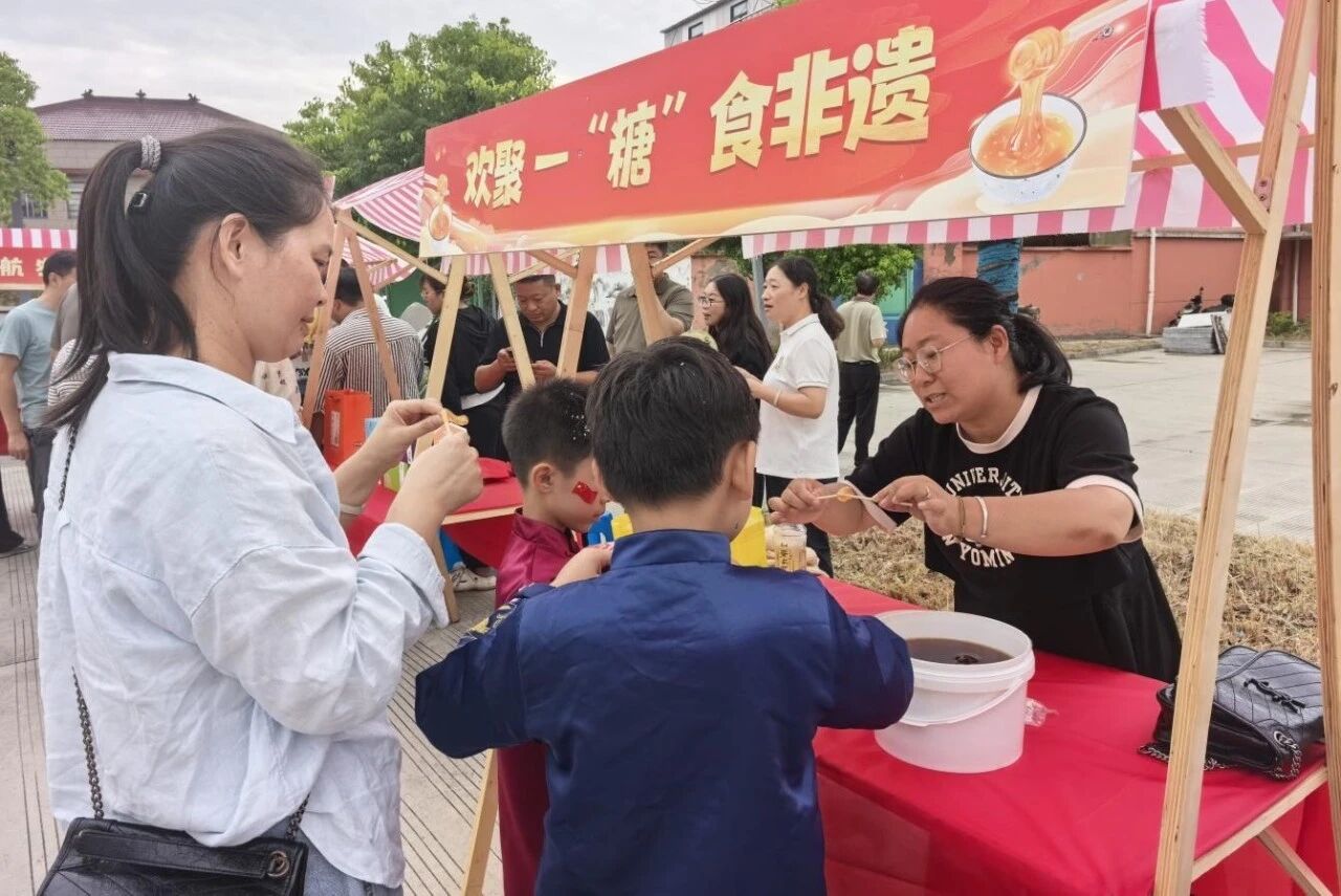 江村社区“欢聚一‘糖’食非遗”摊位前,手艺人手持熬得金黄的麦芽糖坯,手腕轻转、反复拉扯,原本黏稠的糖坯逐渐变得雪白蓬松,孩子们围在一旁目不转睛,跃跃欲试的居民王阿姨上手体验后笑着说:“小时候常见的麦芽糖,这手艺得好好传下去!”