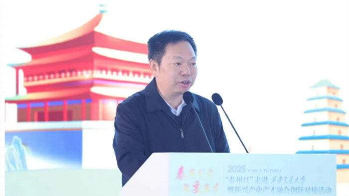 姜冬冬代表泰州市委、市政府对西安交大给予的大力支持表示衷心感谢。在简要介绍泰州经济社会发展情况后,他说,近年来,泰州抢抓“一带一路”和长三角一体化发展的战略机遇,加快建设产业科创强市,全力打造以“大海新晨”为标志的现代化产业体系。近日,泰州队勇夺“苏超首冠”,生动诠释了泰州“三个不相信”的城市精神特质,积极向上、勇于超越的城市风貌。西安交大是一座为民族复兴而生、以西迁精神铸魂的百年学府,培育出一大批国之栋梁,铸就了无数的科研辉煌。泰州与西安交大结缘已久、合作紧密,诚挚邀请各位交大学子从心爱的“仙交大”来到江苏的“凤凰城”,开启属于自己的“星辰大海”。如果选择来泰就业,国家重点实验室等高端平台为你敞开,3万家优质企业“职”等你来;如果选择来泰创业,我们提供最高1亿元的人才专项扶持、单项2000万元的重磅资助;如果选择在泰生活,人才服务私人订制,“凤城英才卡”一卡通享,为你破解“落脚地”“另一半”“下一代”等成长烦恼。热切期盼能有更多与西安交大通力合作、通赢未来的宝贵机遇,让泰州的产业沃土与交大的科研根系共生共荣,结出更多的金色硕果。