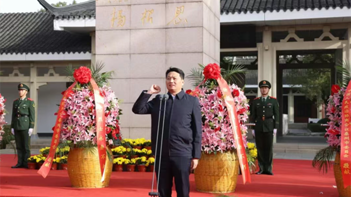 市委书记、泰州军分区党委第一书记姜冬冬缓步上前,仔细整理花篮缎带。他指出,榜样的力量是无穷的,精神的力量是伟大的。杨根思的“三个不相信”英雄宣言,饱含着绝对忠诚、无畏担当、激扬血性和必胜信念,已成为我们血脉永续、根基永固、优势永存的强大基因,更是我们从胜利走向新的胜利的重要精神引领,彰显着强大的精神伟力。